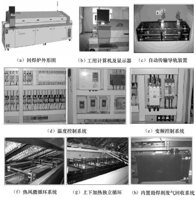 回流爐內部結構主要包括有加熱系統、傳動系統、冷卻系統和控制系統等。外部機構有電源開關、信號指示燈、設備操作接口、緊急開關、抽風散熱系統和傳輸系統等。
